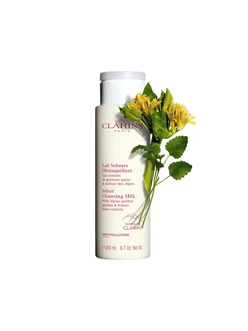 Clarins Velvet Cleansing Milk is a creamy lotion enriched with the gentle complex from Le Domaine Clarins of organic yellow gentian & organic lemon balm eaxtracts which cleanses and comforts while respecting the skin microbiota.